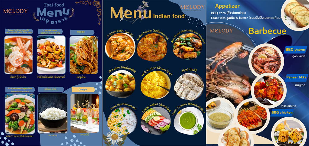| 18:30 | シャロン湾へ戻る際、音楽を聴きながらダイニングルームでバーベキュー、タイ料理、インド料理のディナーをお楽しみください。 |