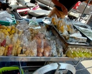 パトンビーチではいろいろな露店を見かけますが、今回紹介するものはふかし芋の露店。 ふかしたオレンジ色、黄色、紫色のサツマイモが並んでおり、お店によってはトウモロコシやたまごなども並んでいます。 ほくほくとして自然の甘味が