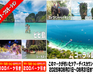 こんにちわ プーケット旅行センターです。 今回はお得なプロモーションのお知らせです。 最大300バーツのディスカウントプロモーション!! 対象 : 大人料金のみ / 子供料金は不可 *該当ツアーは上記が