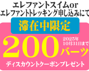 こんにちわ プーケット旅行センターです。 今回はお得なプロモーションのお知らせです。 エレファントスイムまたは エレファントトレッキングを予約にて、 他ツアーで使える200バーツクーポンをプレ
