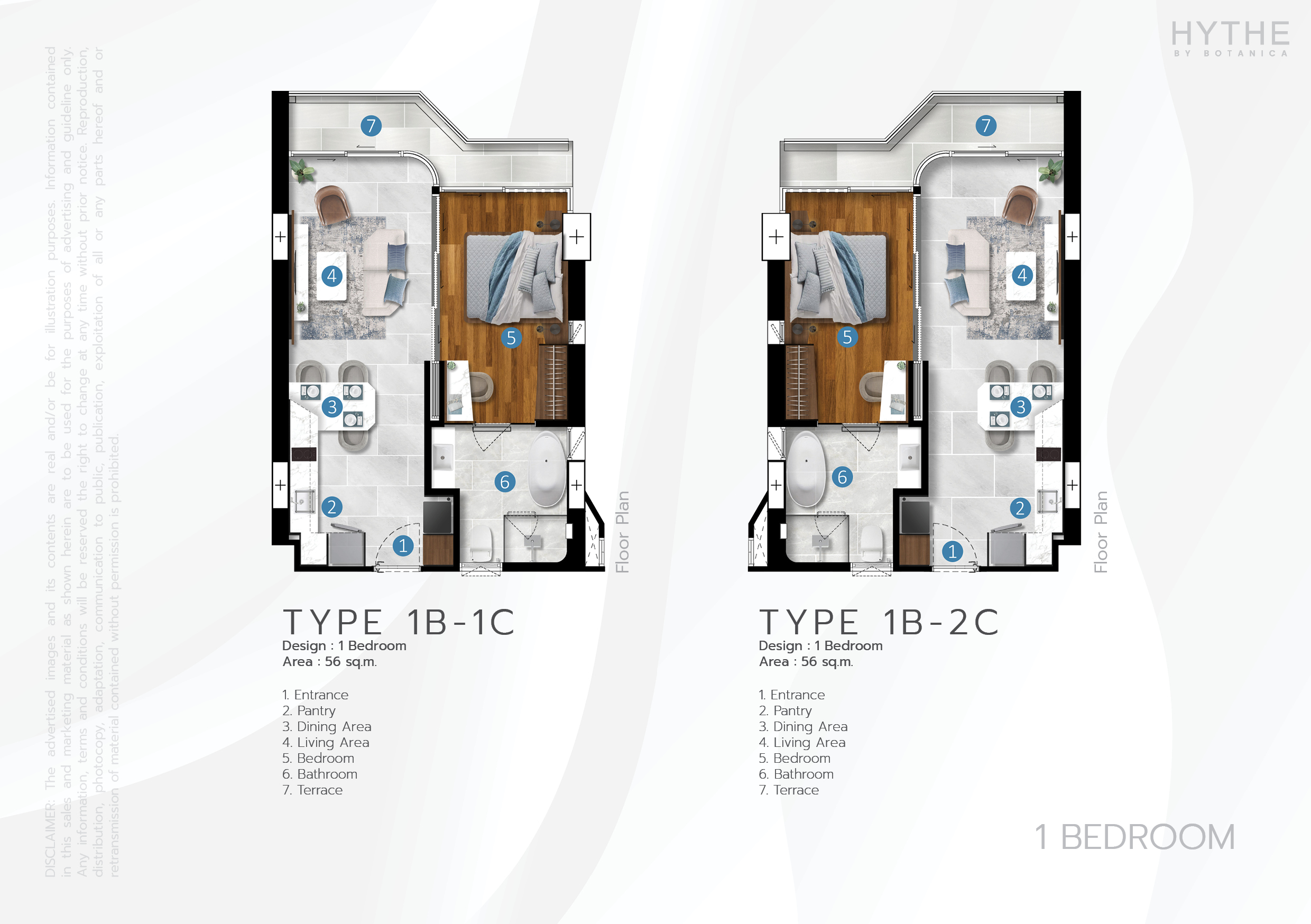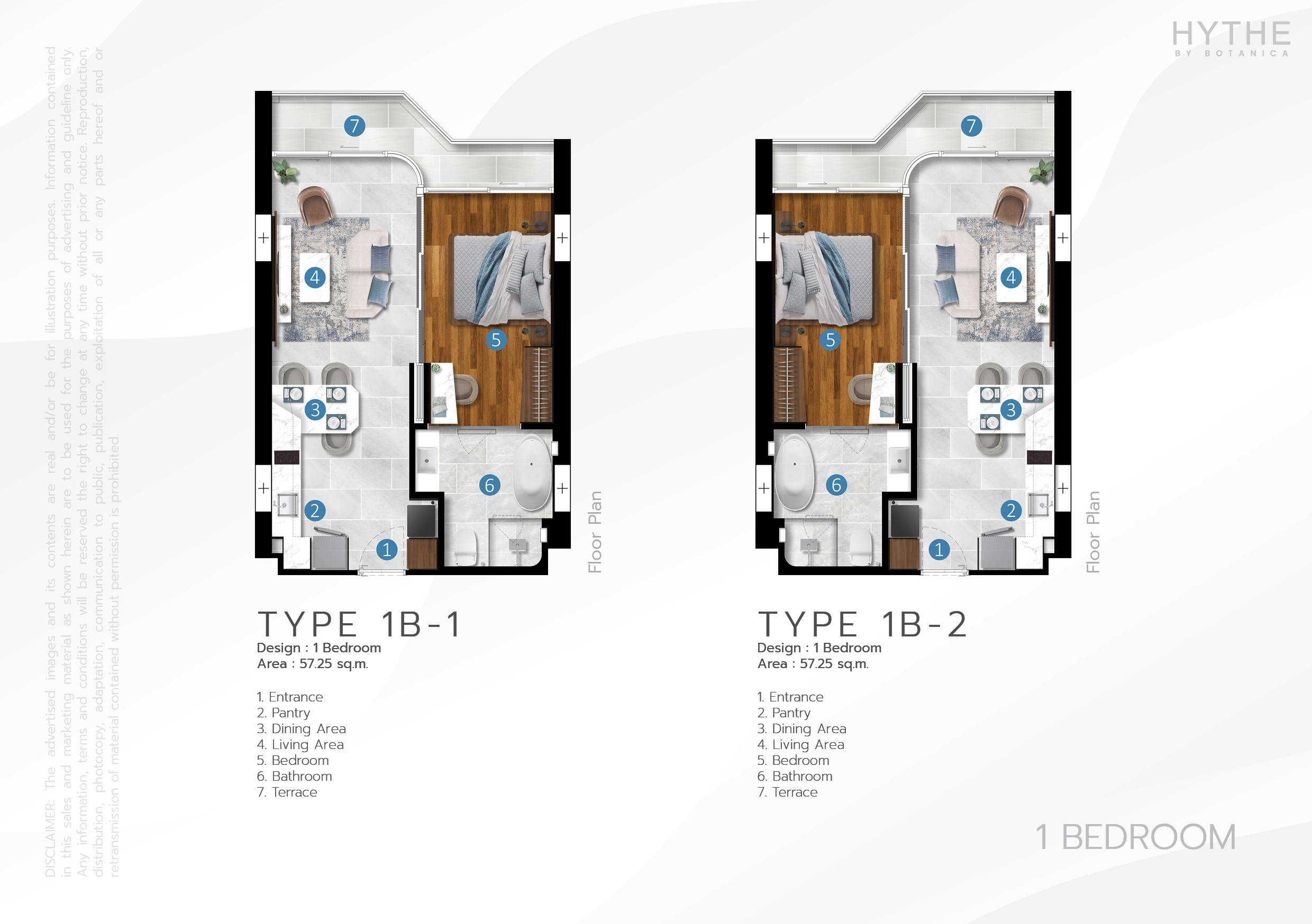 1ベッドルームの間取りは56~57.25㎡であり、かなり広い間取りです。プーケットタウン等で見かける25~35㎡程度のスタジオや1ベッドルームとはことなり、プレミアエリアのラグーナエリアの物件であることから、長期レンタルのテナントを意識した、高級感のあるレイアウトになっております。