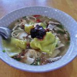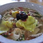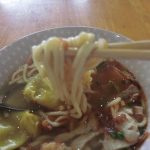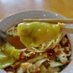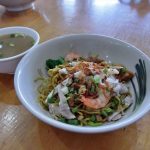今回オーダーをしたものは2種類のラーメンであり汁なし・中華麺 (55バーツ) 、汁あり・中華麺・大盛り (75バーツ)。汁なしのラーメンは中華麺を特製ソースであえた物の上に、海老と豚肉とねぎがちりばめられております。添えられているスープは海老のだしがたっぷりと効いており、このスープだけでもなかなかのもの。汁ありのほうも同様に海老と豚肉が散りばめられていますが、トッピングのプラスで豚挽き肉のワンタンとマナオの風味が効いている辛味噌を追加しました。海老のだしが効いたスープがちょっと太い中華麺がよい食感であり、1店舗で2種類の別のラーメンを食べれるのが魅力です。