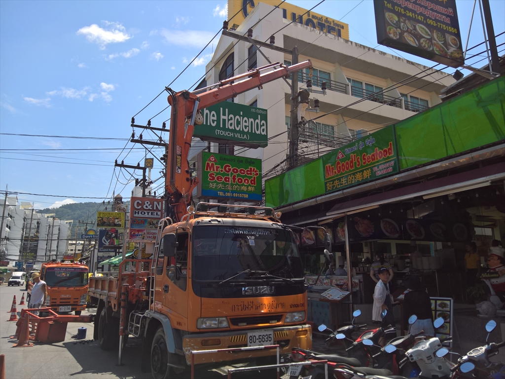 2017年07月18日のパトンビーチ・Rat-U-Thit 200 Rd・11:00頃の風景です。月に1回程度あるのですが、告知無く本日は突然10:30頃に停電となりました。こちら14:30頃には復旧したのですが、工事の進め方、施工側および第3者の安全に対する意識の低さにいつも驚かされます。