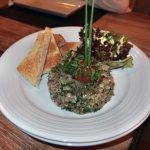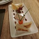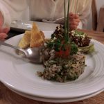 *生白身の魚と生サーモンをコリアンダーやパクチーなどの香草と一緒に和えた品です。お皿に添えられたトーストの上に載せて食べるとトーストのサクサク感との相性がよく、パクチーの味が結構強いく、パクチーが好きな方にはたまらない一品でしょう。とてもあっさりしていて食べやすく、タイの食材であるパクチーをフレンチに使用しているのは驚きです。