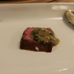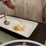 上に置いてあるシュリンプが目を引きますが、実は下の薄いラビオリが絶品の品です。ラビオリの間にロブスターが挟んであり、ロブスターのうまみが凝縮されたソースとの相性は抜群であり、贅沢な風味が楽しめました。
