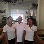 オーナーのGeorgesさん(1人で写っている方)よりお話を伺ったところ、Café De Paris Patongをオープンする前はパトンビーチの有名なフレンチレストランのオーナーであったとの事。また、フランスで修行をされたAlainさん(女性スタッフに囲まれた方)がシェフをされており、主な食材はフランスから空輸されたものを使用しているので、本場の味がパトンビーチでも楽しめるようになっています。