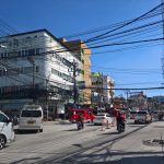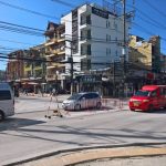 2018年02月28日のパトンビーチ・Sawatdirak RdとRat-U-Thit 200Rdの交差部・15:45頃の風景です。2017年末より開始した冠水対策でロイヤルパラダイス前の道路からこの付近まで工事を引き続き行っております。道路下へのタンク設置は終わり、表面はコンクリートを流して固めたため、とても硬い道路となっています。アスファルト舗装はまだの様で埃が舞い易い状況です。また、歩道は写真のように平板を完全に設置しておらず、引き続き歩きにくい状況になっています。3月中にパトンビーチへご旅行をされる際、ビーチサンダルでは怪我をし易いと思いますので、靴底の厚いクロックススタイルのサンダルなどを利用されることをお勧めします。