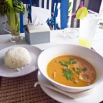 店内はクーラー設備のない開放感のあるオープンエアスタイル。リゾートらしいブルーとホワイトを基調とした店内のデザインはビーチ沿いのレストランというイメージがぴったりです。さて、このレストランの特徴はなんと言ってもパトンビーチのそばという事。道路を挟んで向いに青々としたビーチが広がっており、ビーチを眺めながらの南国のリゾートならではの食事が楽しめます。今回私が注文した物はマッサマンカレー(牛肉入り) 180バーツ 、ライス -30バーツ 、レモンジュース -120バーツの3点。カフェ・デル・マー ( Cafe Del Mar ) のロケーションはパトンビーチの北端側にあるためツーリストがあまり集まらない場所です。そのためガヤガヤとした中心街とは異なる、のんびりとした空間が楽しめるでしょう。