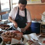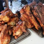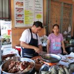 ガラスケース内や店頭に並んでいる食材・ムーコーブ(豚バラ肉を揚げたもの)、ムーデーン(焼豚)、ガイヤーン(鶏肉のバーベキュー)が丸のまま置かれているのでとても迫力があります。