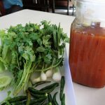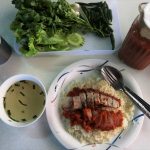 今回オーダーしたものはスタンダードな物・カオ・ムーデーン・ムーコーブ。鶏肉のだしで炊いたご飯の上にムーコーブ(豚バラ肉をローストしたもの)&ムーデーン(焼豚)が盛られており、付け合せにチキンスープが提供されます。またテーブルにはパクチーやねぎなどが盛られてあるお皿が置いてあり、各自好みでご飯の上に乗せます。