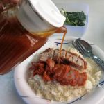 テーブルの上にはチキンライス様や各種ご飯用のソースが置かれておりますが、このご飯には甘辛い写真のソースをかけてください。(どのソースを使ったらよいか分からない場合は、スタッフに聞くか。周りの人が何を掛けているか見たほうが良いでしょう。)
