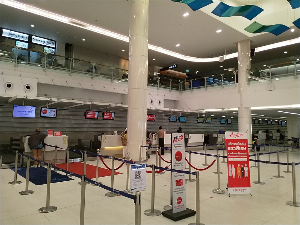 1番ゲート ( 国内線はここがミーティング場所です。 ) / 2番ゲート ( 外から建物内に入る為の入り口 ) - 2階 — 出発階・( 正面左側がタイ航空、右側がAIR ASIAなどの搭乗LCCカウンターです。)