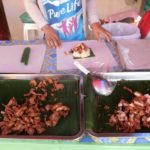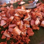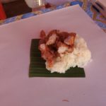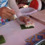 以下写真のものは1個・20バーツ/個であり、スタッフの方に注文するとバナナの皮の上にもち米を敷いて、その上にムートート(揚げ豚)を載せて、包んでくれます。[ 揚げ豚 ( ムートート/หมูทอด )の単品のオーダーも可能です。)