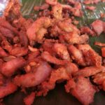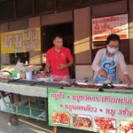 ここはご夫婦でこのお店を切り盛りしているようで、早朝06:00にオープンし、08:30頃に店じまいのスタイルです。お店のウリは揚げ豚 ( ムートート/หมูทอด )は豚肩などの赤味部分を使ったものや、豚バラを使った脂身の多いものを下味&衣をつけて揚げ、一口サイズにぶつ切りにしたものであり、ちょっと濃いめの味付けなので、ご飯のおかずにぴったりの逸品です。また、串に刺した焼き豚も販売しています。