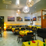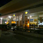 その看板の向いが目的地のレオ&マス リストランテ イタリアーノ エ ピッザーリア ( Leo & Mas Ristorante Italiano e Pizzeria ) です。屋外のテーブルとクーラーの効いた屋内の2種類のテーブルが用意されております。お店の屋内の雰囲気はホワイトを基調としていますが、テーブルクロスやナプキンなどは原色のイエローやレッドを使い、ちょっと明るいデザインですが、照明は明るすぎず、暗すぎずといった丁度良いライトアップのため、ゆっくりと食事が楽しめるような雰囲気でした。