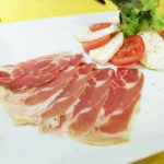 大きめにカットされたモッツアレラチーズとフレッシュなトマトの上に、オリーブオイルと乾燥バジルがちりばめられた「カプレーゼ」。トマトやチーズはもちろんですが添えてある生ハムがとても美味しく、付け合せのパンの上にのせて食べると更に美味しく味わえました。