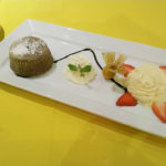 これもまた、スタッフおすすめの本日のデザートです。短冊形の細長いプレートにカットイチゴが添えられたバニアライスクリーム、ミントが添えられたホイップクリーム、フォンダンショコラが並べられています。正直、フォンダンショコラはただのパンケーキかと思いカットしたところ、中から暖かいトロトロのチョコがたくさん溢れでてきて来ました。