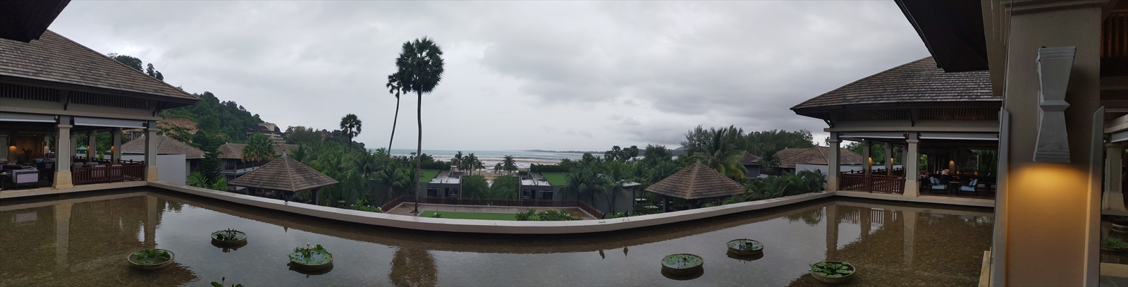 本日は1日中雨がちな天候であり景色はいまいちですが、天気の良い日はプーケット マリオットリゾート&スパ ナイヤンビーチのロビーからの眺めは、空のスカイブルー&海のマリンブルーが絶妙に融合された素晴らしい景色が楽しめます。