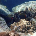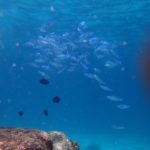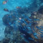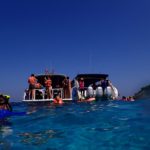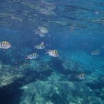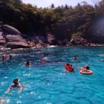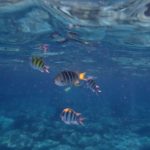 スピードボートへ揺られながらおおよそ30分程度経過したのち、ラヤ島のシュノーケリングポイントへ到着しました。その際、船内にてスタッフよりシュノーケル&マスクが配られ、スピードボートの後ろから直接飛び込み、シュノーケリングタイムの開始です。海の中は比較的透明度が高く、トロピカルな魚を沢山見ることが出来ました。