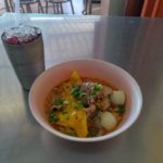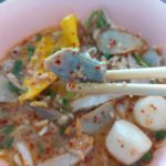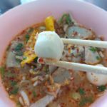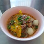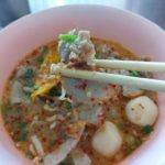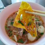 これは甘辛いトムヤムのスープの中にセンレック (稲庭うどん程度の太さの米麺)が入ったものです。ここのラーメンはワンタンの皮を上げたものや綺麗に処理をされた豚もつ、肉団子、もやしなどががたっぷり入って有り、その上に分葱&パクチーが散りばめられているかなりの具だくさん。これが地元で人気の理由なのでしょう、私が食べている間にランチ時間が近くなり、どんどんと人が入ってきました。