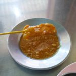 焼き場で沢山焼いていたサテー ( 50バーツ/10本入り ) はピーナッツの甘みとちょっぴりの辛みが入った甘辛いソースをディップして食べるもの。1本のサイズが1口サイズでちょうどよく、ラーメンの箸休めにはもってこいの一品です。