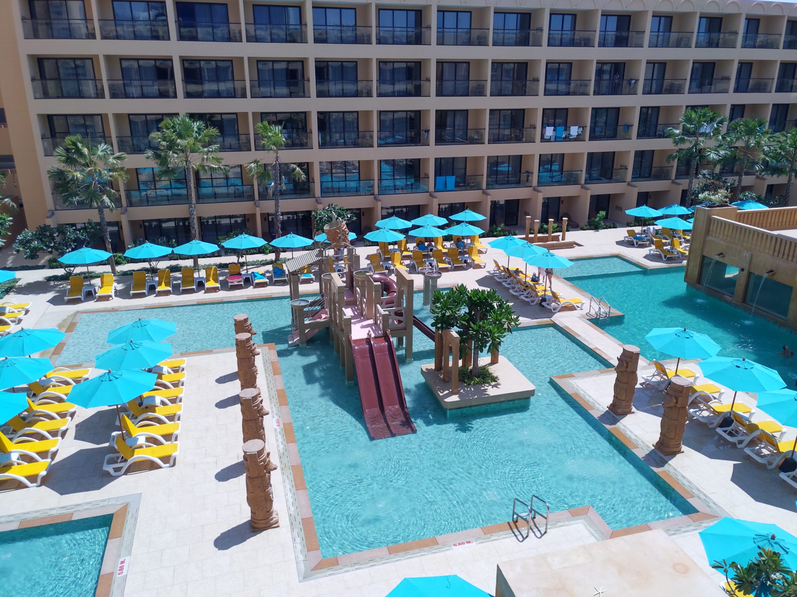 大きな4か所あるスイミングープールの3か所を跨いで建てられている大きな建物。ここには以下3タイプのウォータースライダーがあります。