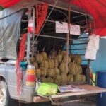 最近、沢山のドリアンをトラックの荷台に載せ、移動販売を行う風景を目にするようになりました。これはタイは5月~8月頃になるとドリアンやマンゴスチンなどのフルーツが美味しくなる時期だからです。もちろん、大手スーパーなどでもドリアンは見かけますが、値段が高いため、地元の人たちはこういう移動販売を利用するようです。