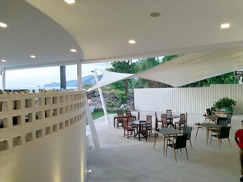 エアコンの効いた店内のテーブルと屋外のオープンエアのテラスにあるテーブルがあり、以前と比べるとテラス席が広くなり、雨をしのげるようなテントも設置されたため、多少の雨でも屋外で安心して食事が楽しめるようになりました。また、サンセットが臨めるテラス席は非常に人気が有り、17:00頃から多くのお客様でにぎわっております。