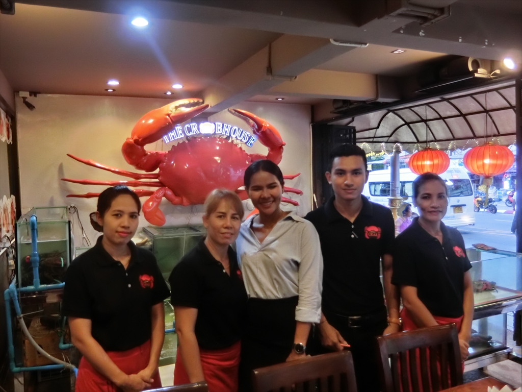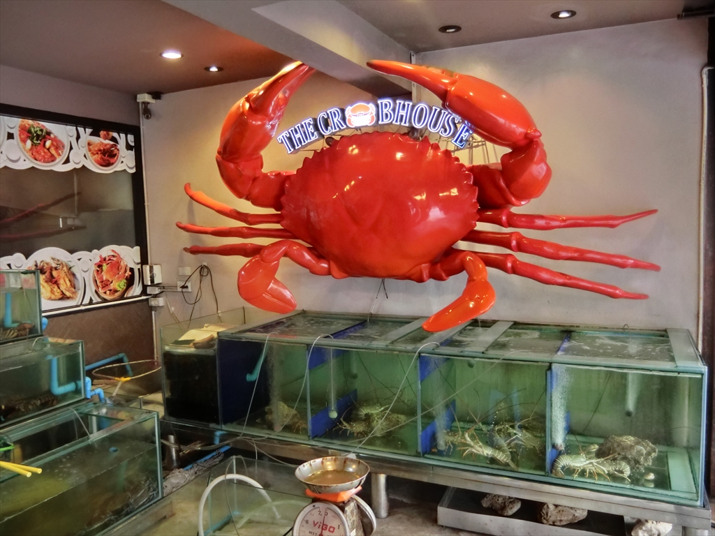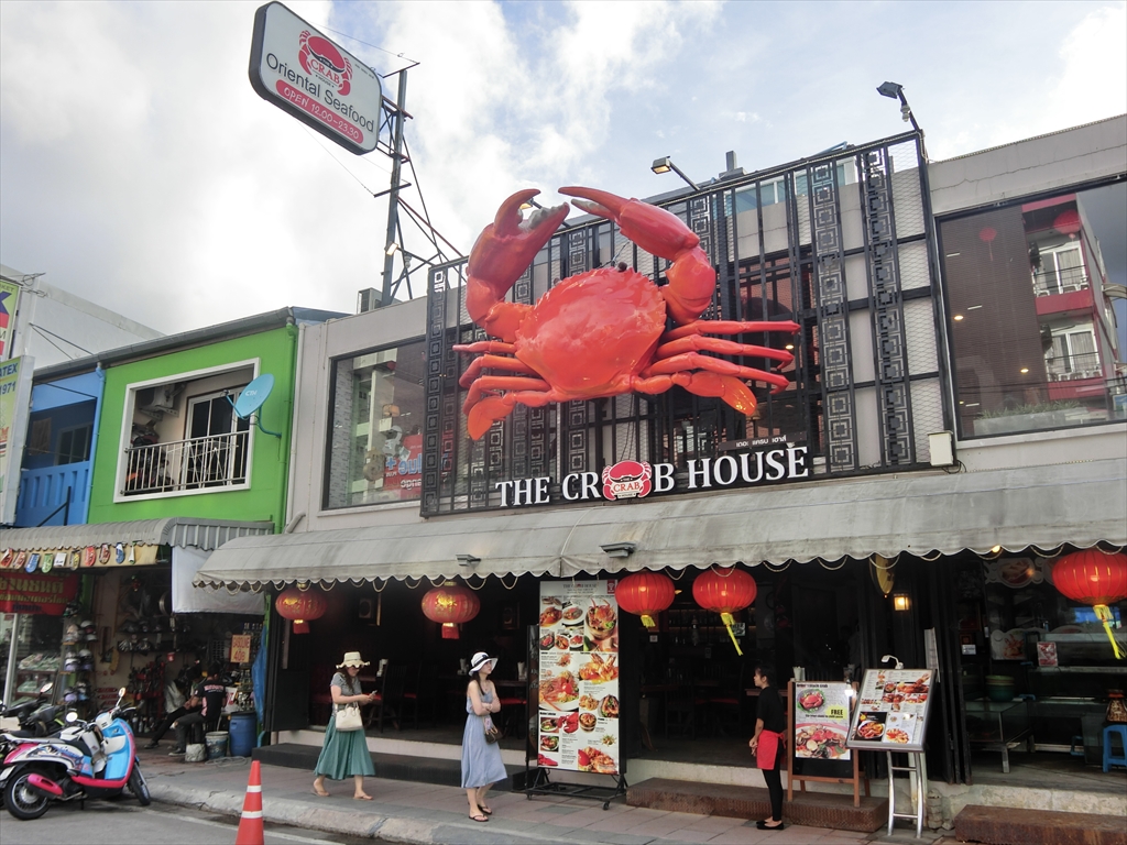 ザ・クラブ・ハウス ( THE CRAB HOUSE )はビーチからSainamyen Rd を入り、パトン病院が見えたら、右に曲がったPhangmeung Rd沿いにあるシーフードレストランです。日本で有名なかにのレストラン・かに道楽やかに将軍のような大きなかにのオブジェの看板が目印ですのですぐにわかると思います。