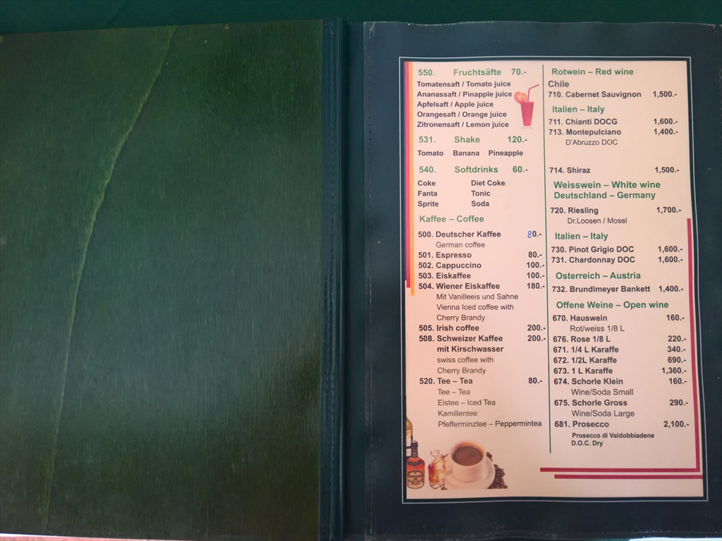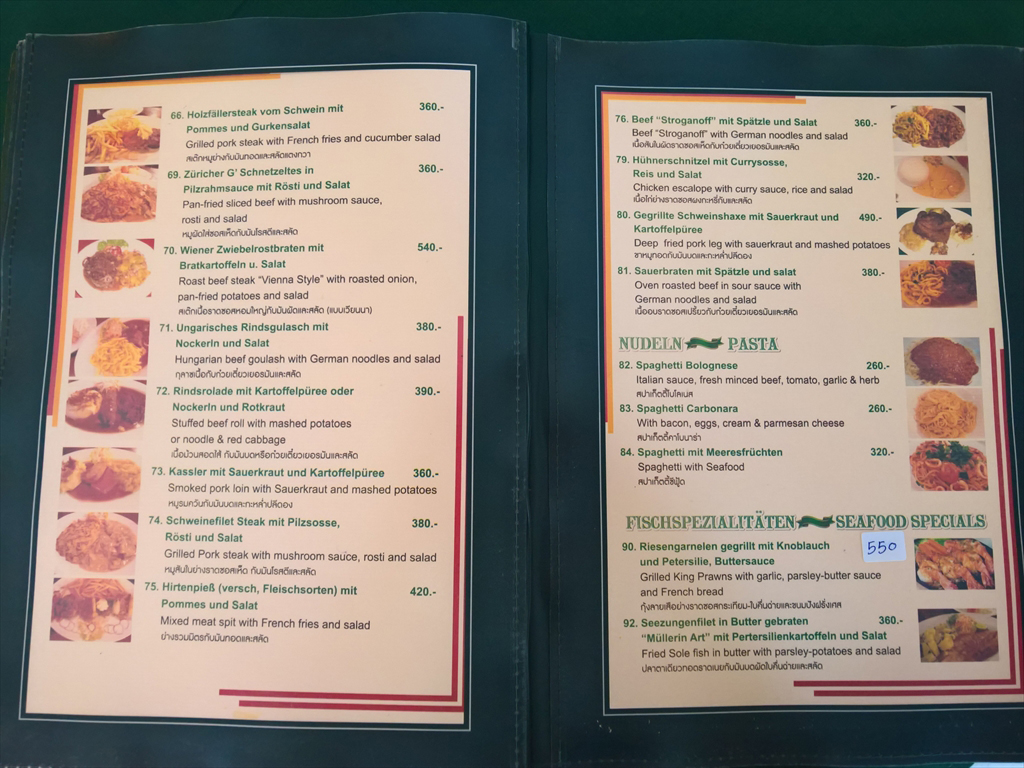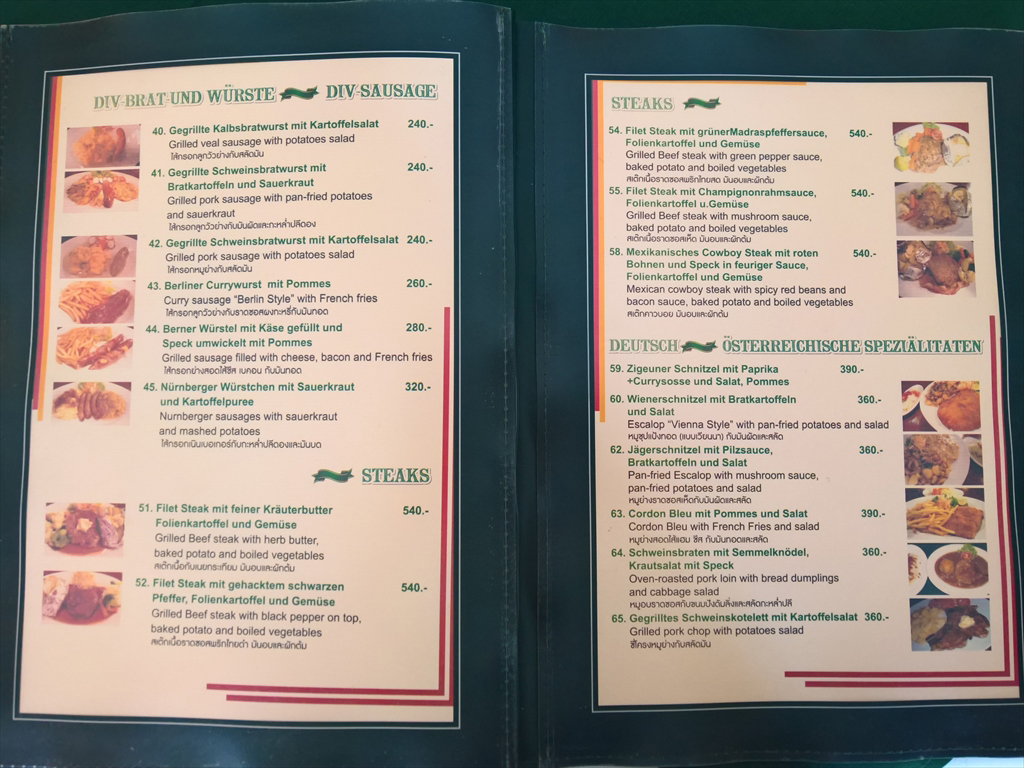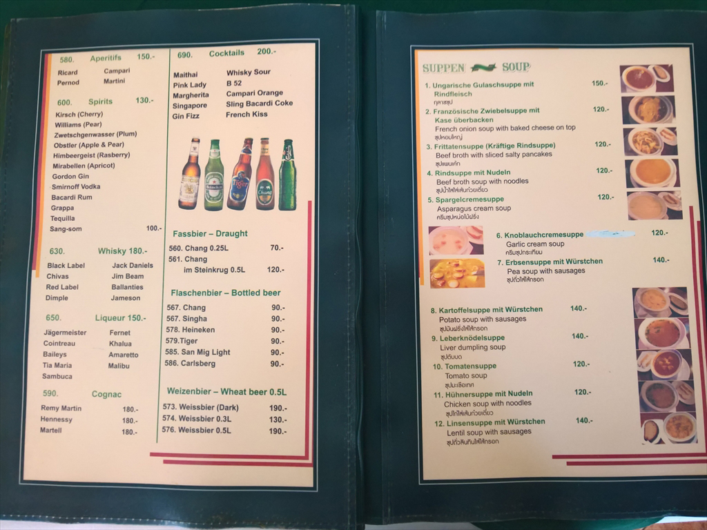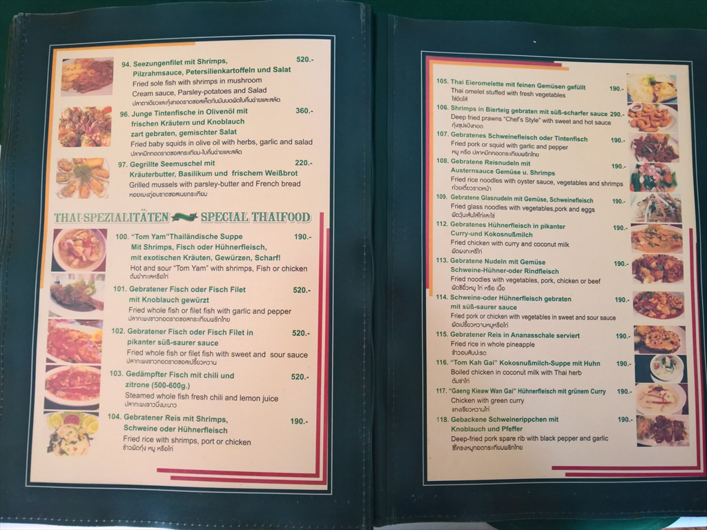 メニューは日本語表記はありませんが英語、ドイツ語、タイ語で書かれており、左側に小さな写真が添えられています。オーダーに迷ったときはスタッフお勧めの料理をオーダーするとよいでしょう。