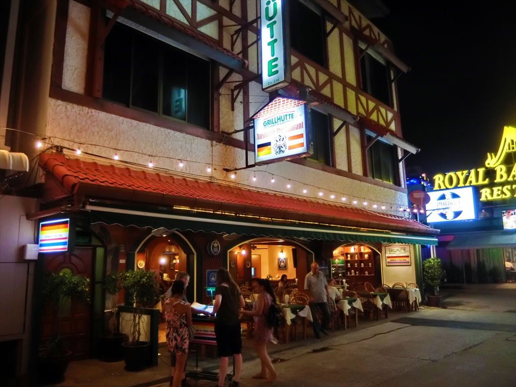 グリルハット ( GRILLHUETTE ) はパトンビーチのビーチ通り沿いの小道・SOI FOODLANDを入って左側にあるレストランです。ロッジを意識した可愛らしい外観の建物であり、ドイツ国旗とオーストリア国旗が記された三角屋根の看板があるのですぐに分かると思います。木の質感を生かしたオープンエアの店内は最近の店舗にはない暖かさが感じられ、ゆっくりと食事を楽しめる雰囲気を与えてくれます。(写真の男性は見せのオーナーMr. Peterさんです。)