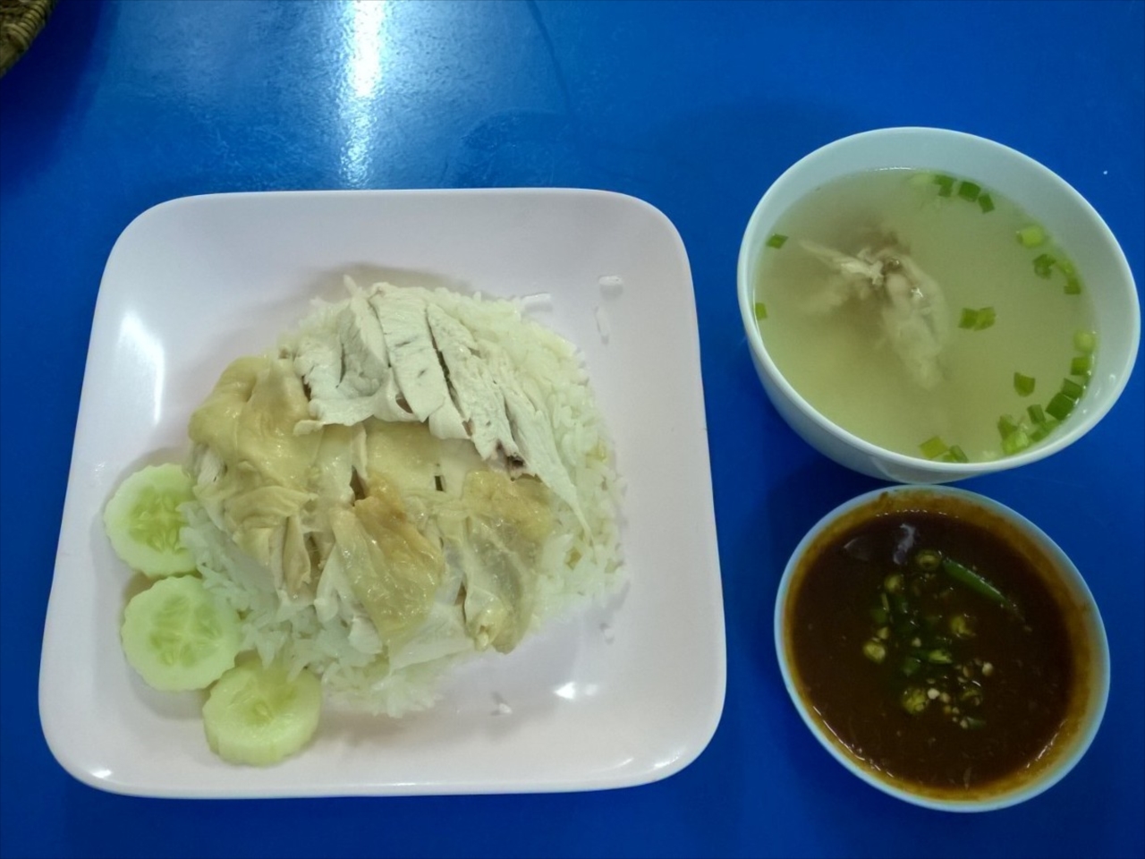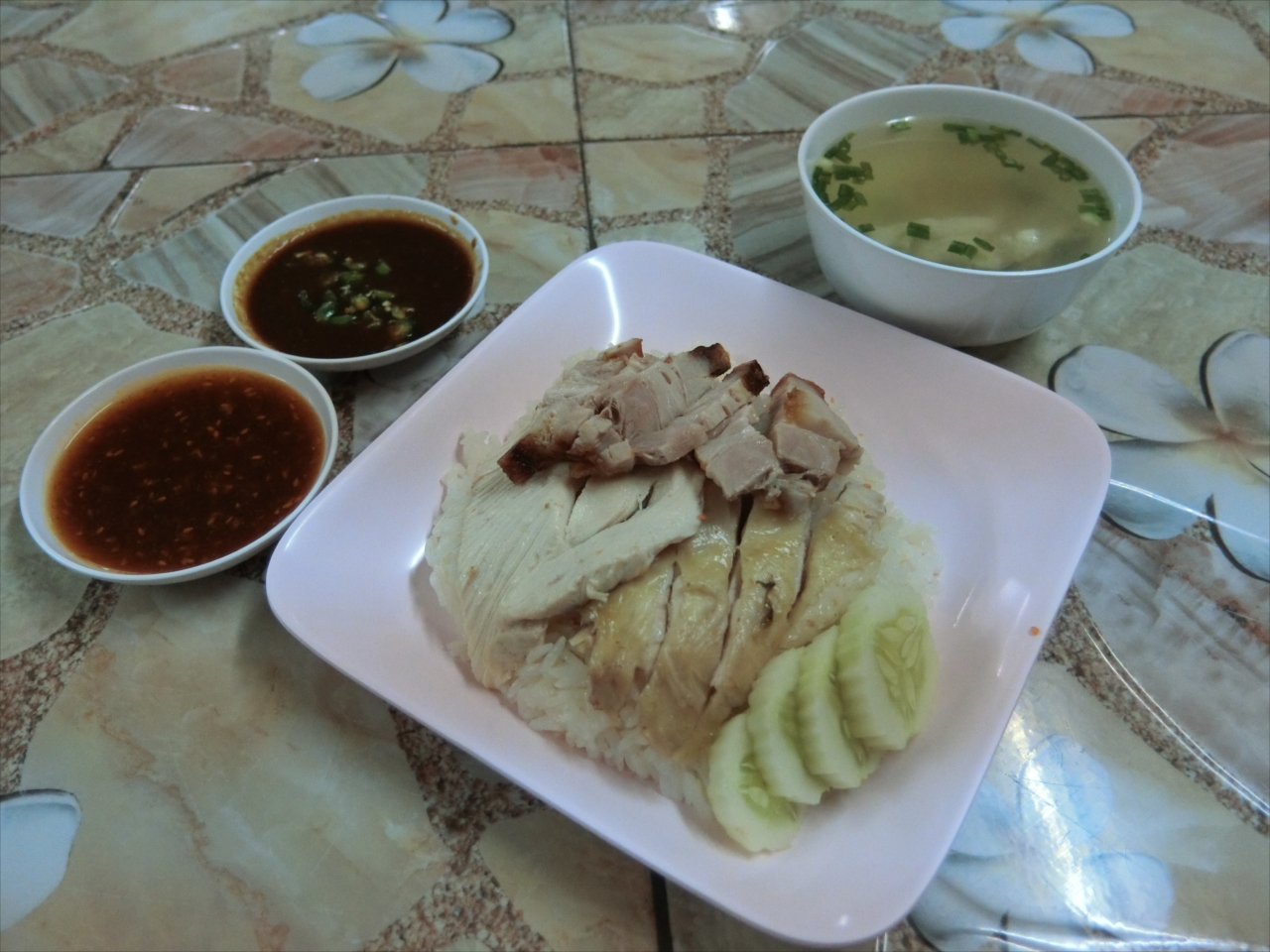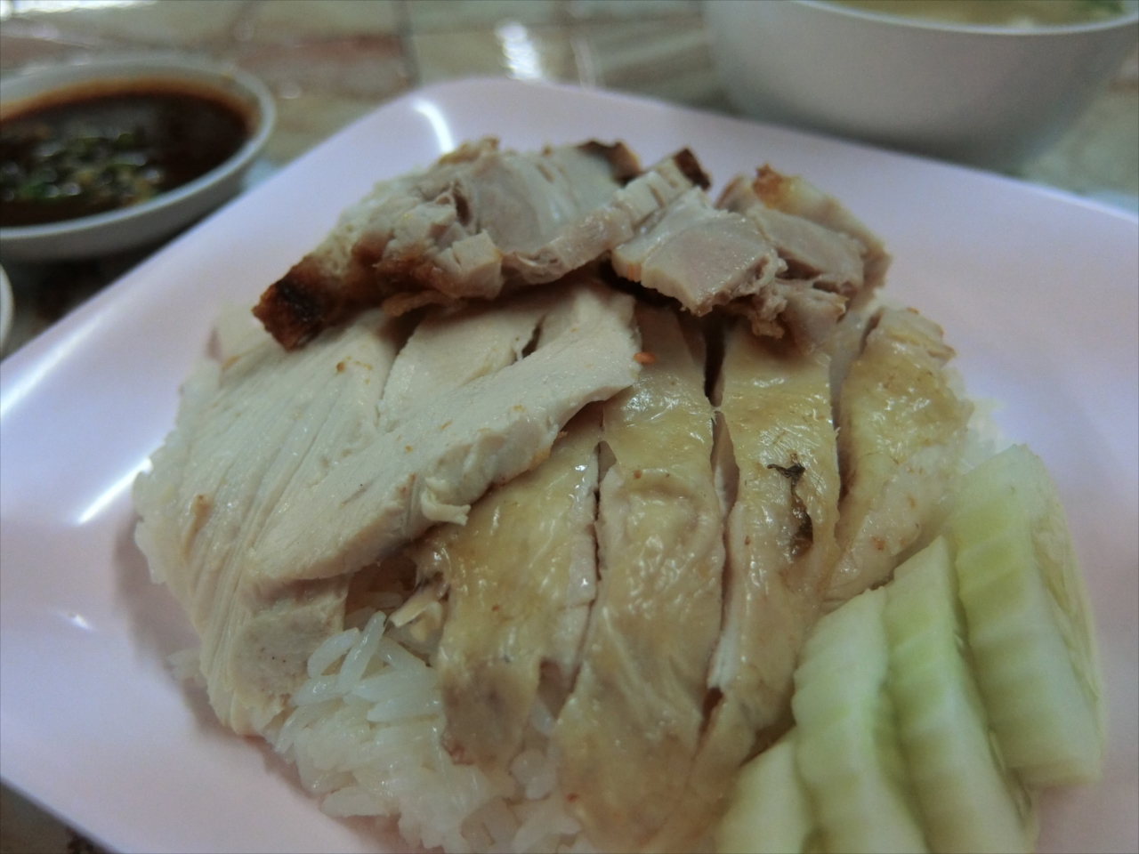 全乗せも可能(鶏肉、焼き豚、揚げ豚)。大盛りは注文の際、ピセーと言いましょう。場所はアンダマンビースイートホテルそば。鶏肉の丸蒸しが目印。