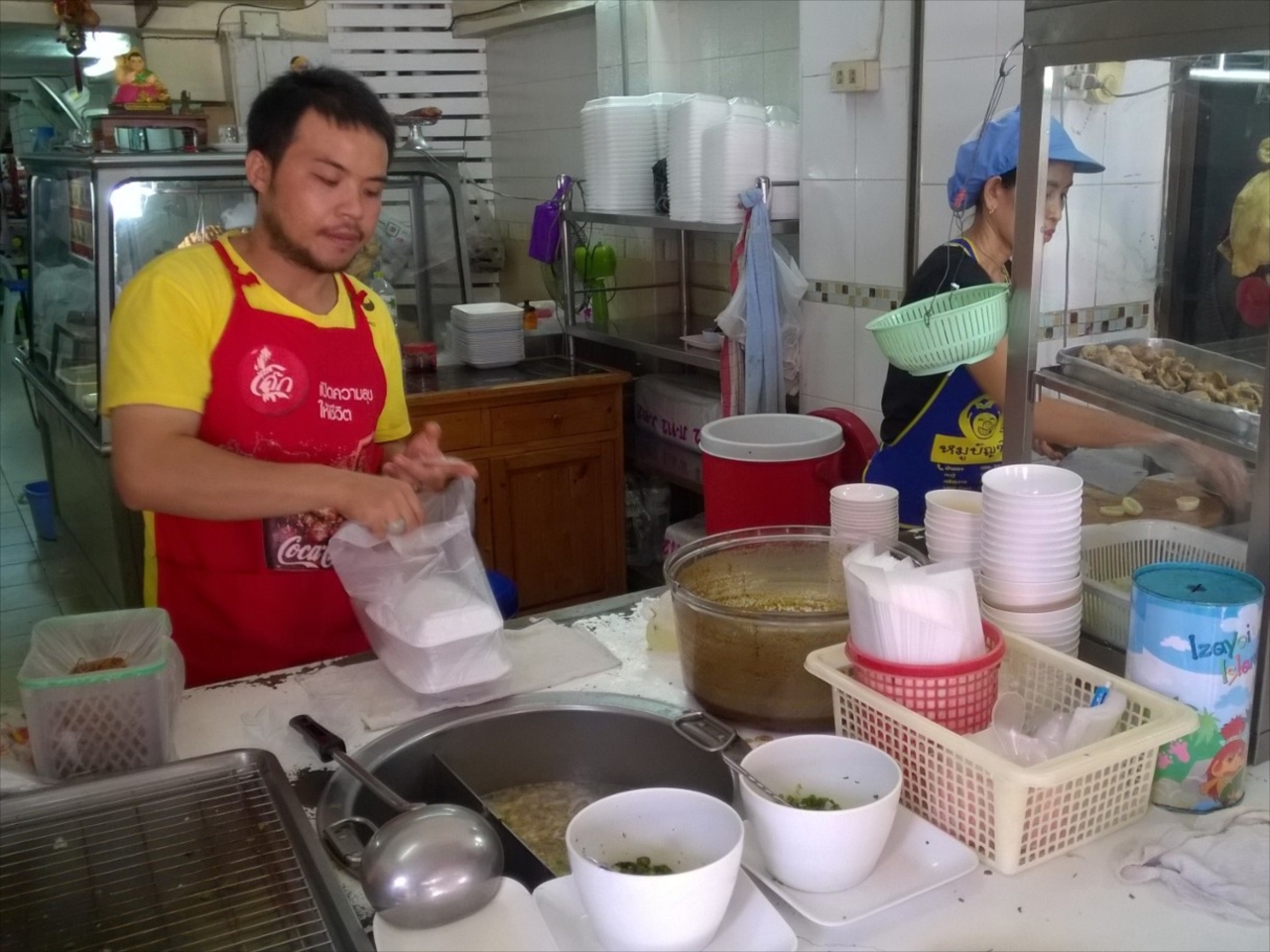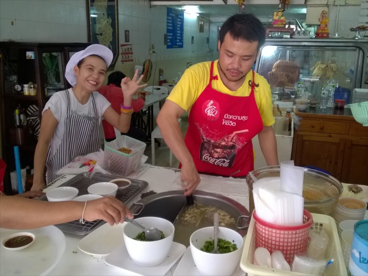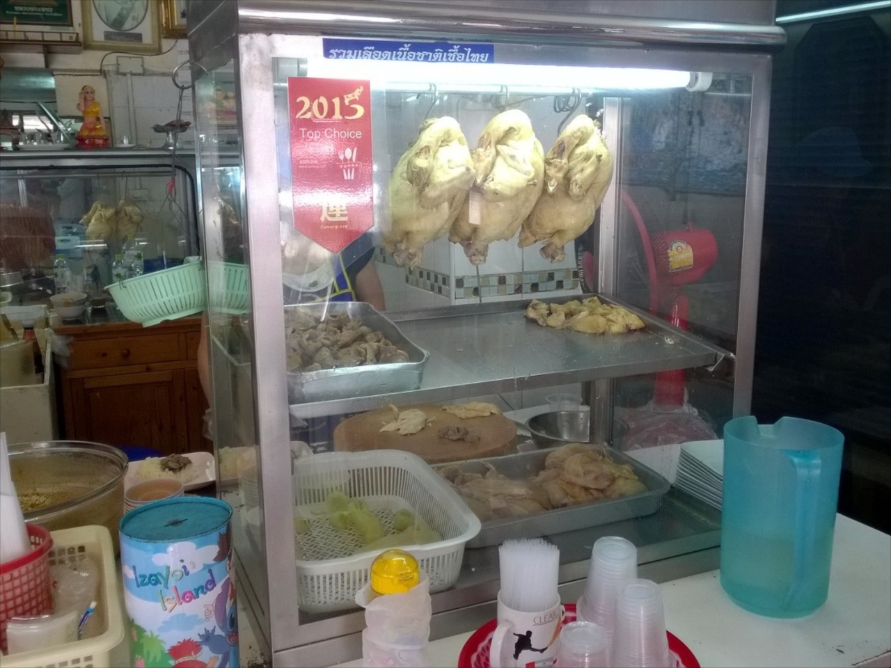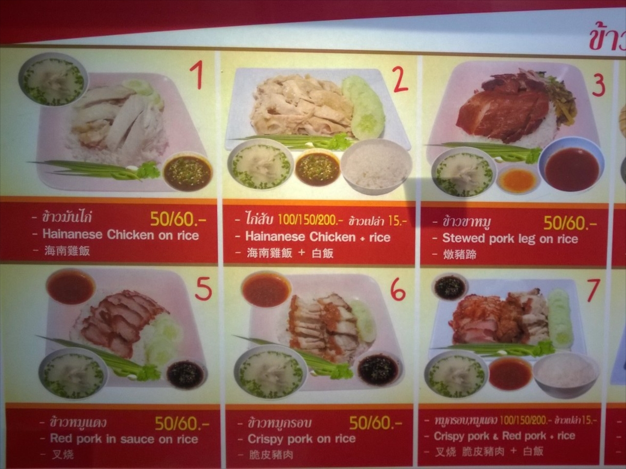 全乗せも可能(鶏肉、焼き豚、揚げ豚)。大盛りは注文の際、ピセーと言いましょう。場所はアンダマンビースイートホテルそば。鶏肉の丸蒸しが目印。